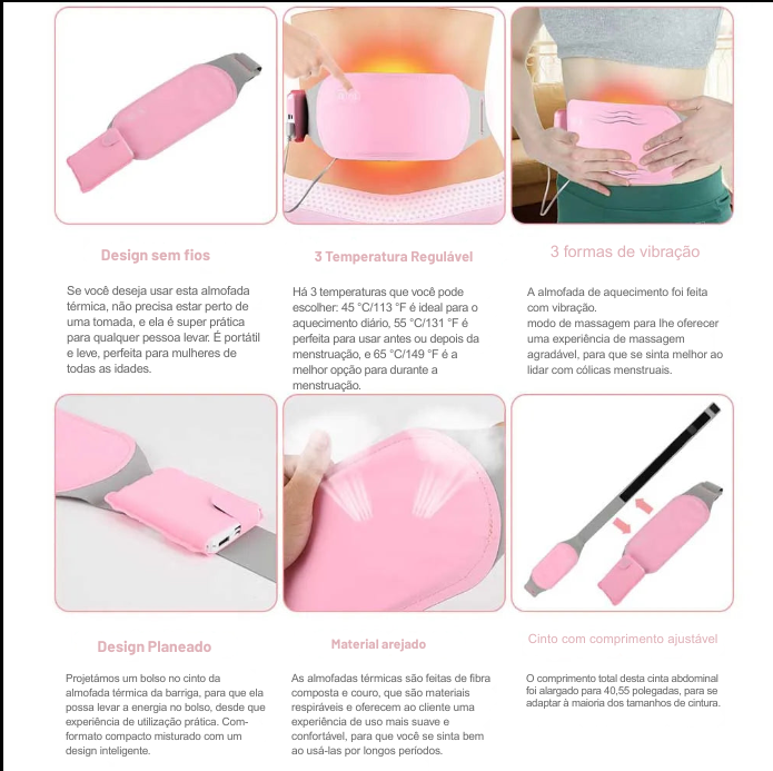 Descubra a Cinta Térmica SALORIE, desenvolvida para proporcionar alívio imediato e conforto incomparável para dores menstruais, cólicas e tensões abdominais. Com funções de aquecimento e massagem vibratória, este aparelho portátil é o companheiro ideal para dias difíceis.